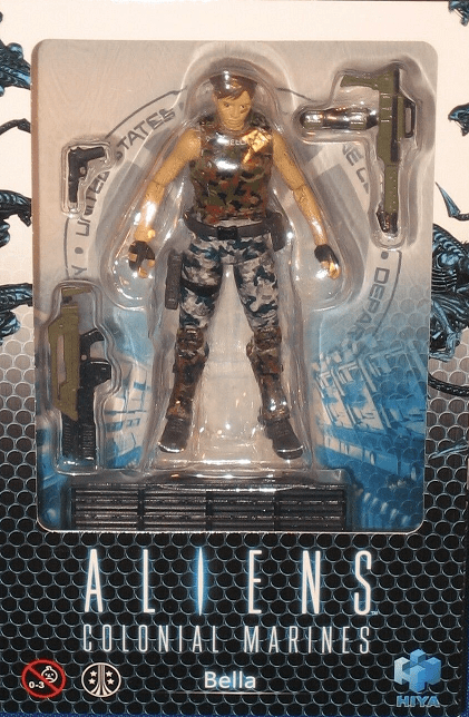 Hiya Toys Aliens Colonial Marines Private Bella Clarison Figure is 4" in height (1/18 scale), features full articulation, comes with a variety of accessories, and a stand for display.