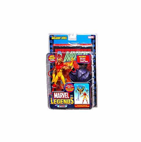 Marvel Legends Onslaught Series 13 Pyro is 6" tall. A super-poseable figure which with a base that can be mounted on a wall for display and a full sized comic book. It features over 30 points of articulation and can be put in nearly any position. Also contains a piece of the build-a-figure Onslaught.