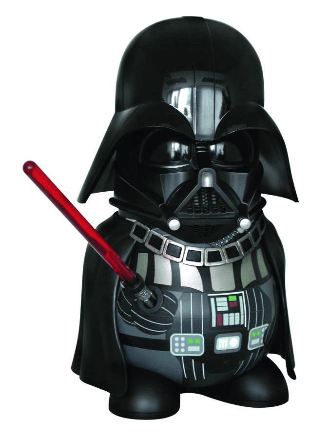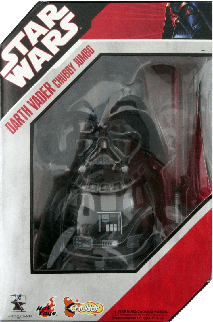 Star Wars Jumbo Chubby Darth Vader Figure stands approximately 9.5" tall. Features a super-deformed design with an oversized head, a removable helmet and breathing mask that reveal Anakin Skywalker underneath, magnetic base, and a transparent lightsaber.