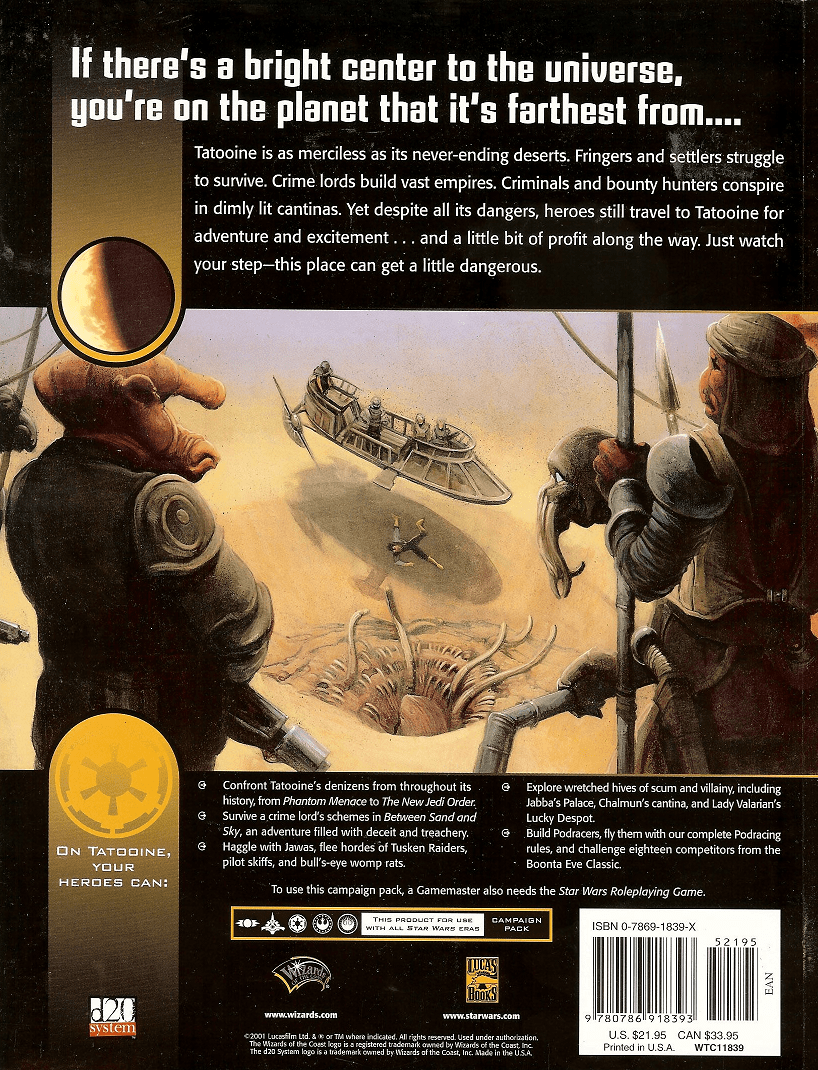 WOTC Star Wars Secrets of Tatooine Sourcebook contains Life On Tatooine, Settling Tatooine, Cities Of Tatooinem, Podracing, and Between Sand and Sky.