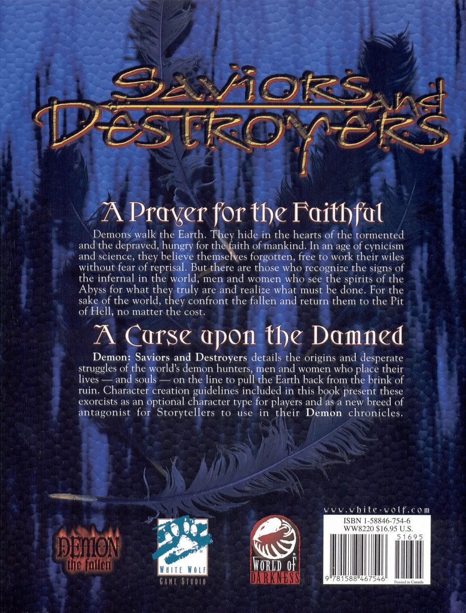 White Wolf Demon The Fallen Saviors and Destroyers Sourcebook details the origins and desperate struggles of the world's demon hunters, men and women who place their lives - and souls - on the line to pull the Earth back from the brink of ruin. Character creation guidelines included in this book present these exorcists as an optional character type for players and as a new breed of antagonist for Storytellers to use in their Demon chronicles.